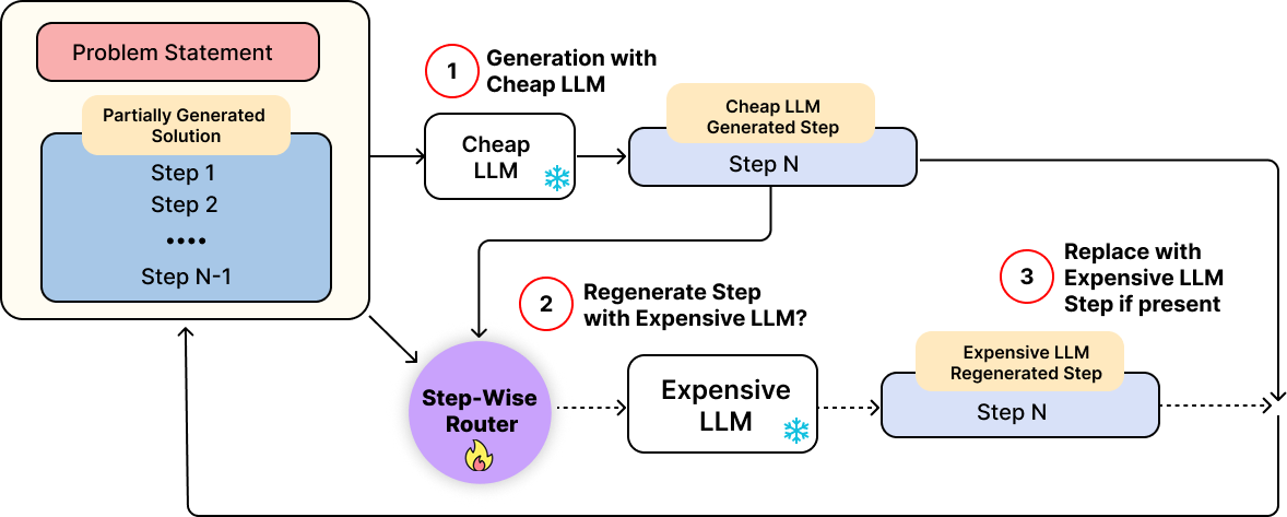 Consider a two-model setup: a weak, cheap model Mw and a strong, expensive model Ms. At each reasoning step, Mw proposes a candidate continuation, and the TRIM router decides whether to keep it or regenerate it using Ms.